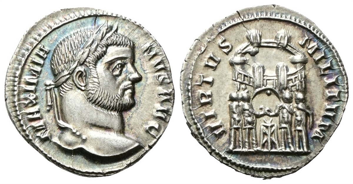 Dr. MAXIMIA - NVS AVG. Testa laureata a d. Rv. VIRTVS - MILITVM. I quattro tetrarchi (Diocleziano, Massimiano, Costantino e Galerio), giurano su un’ara; sullo sfondo, porta di una accampamento con sei torri.