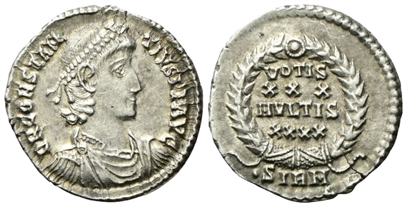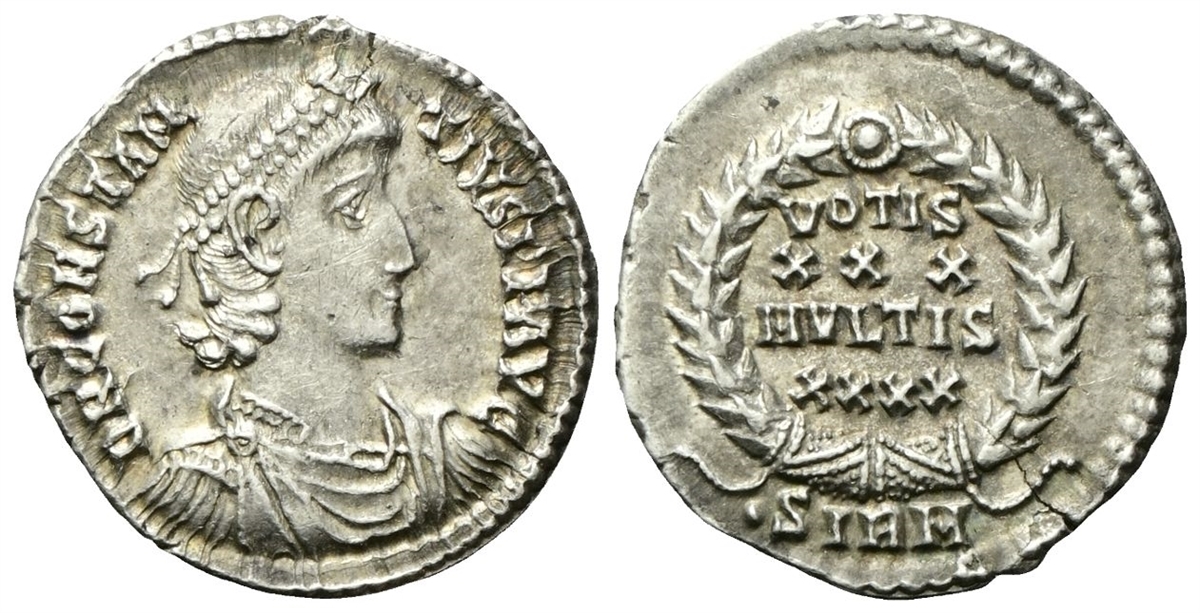 Dr. d N CONSTAN - TIVS P P AVG. Busto, diademato, drappeggiato, corazzato a d. Rv. VOTIS / XXX / MVLTIS / XXXX. Iscrizione disposta su quattro righe entro corona di foglie di alloro; in esergo. •SIRM.