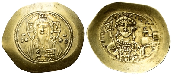 Dr. Mezzo busto di Cristo Pantocratore, con nimbo crociato, indossa tunica e himation, mano d. sollevata in atto di benedire; regge il Vangelo; ai lati, IC - XC. Rv.+ MIX - AHΛ - RACIΛO Δ. Mezzo busto dell’imperatore, coronato, indossa loros e saccos, regge globo crucigero e un vessillo gemmato con pallino sull'asta.