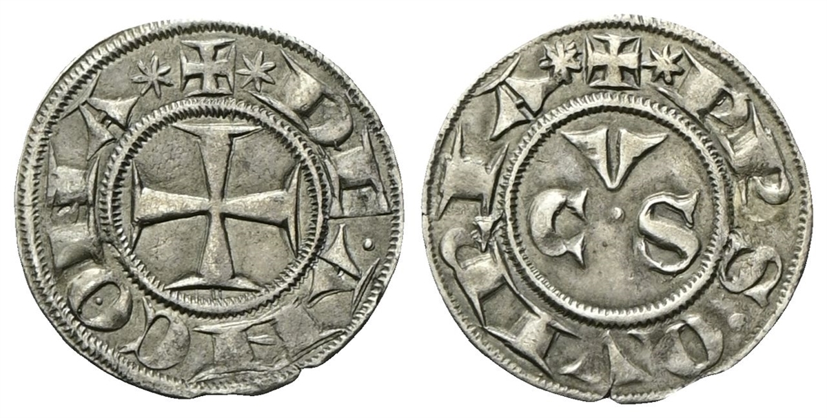 Dr. +✶DE• ANCONA✶. Croce patente. Rv. + ✶PP S • QVIRIA✶. Le lettere CVS attorno a globetto.