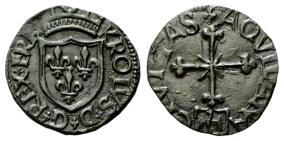 Dr. KROLVS +D+REX+G+ REX+ FRR. Scudo di Francia coronato. Rv. CIVITAS+ AQVILANA. Croce tribolata su quattro raggi sopra aquiletta.