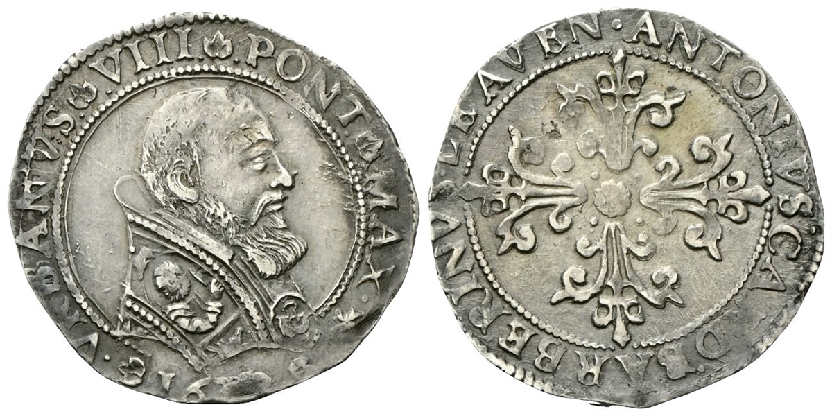 Dr. (foglia) •VRBANV•S•(foglia)• VIII •(foglia)•PONT•(foglia) MAX•(foglia) (segno di zecca). Busto a d. con piviale decorato con San Pietro; sotto, 163[8](foglia). Rv. •ANTONIVS CARD •BARBERINVS LE AVEN. Croce fiorata.