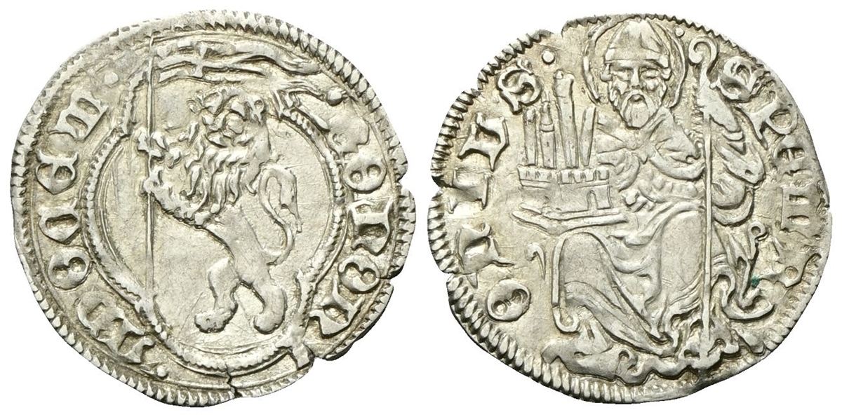 Dr. •BONONI - •A DOCET•. Leone vessillifero rampante verso d. Rv. S PETR - ONIVS•. Il Santo, seduto e frontale, regge il pastorale e il modellino della città.