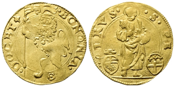 Dr. •BONONIA• -✿ - •DOCET(giglio). Leone vessillifero rampante verso s. Rv. •S• PE - TRVS•. San Pietro stante con chiavi e Vangelo; ai lati, armetta del Cardinale Cybo e della città di Bologna.
