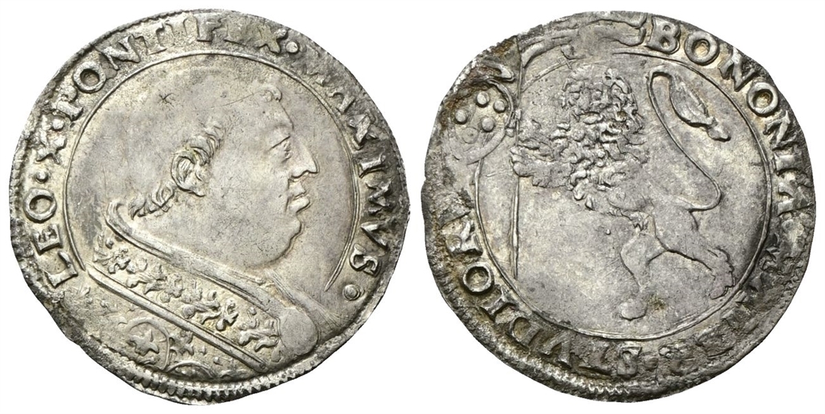 Dr. LEO•X•PONTIFEX• MAXIMVS•. Busto a d. con piviale ornato da fogliami. Rv. BONONIA •MATER •STVDIORV’. Leone vessillifero rampante a s.; in alto, a s. del vessillo, armetta card. Medici.
