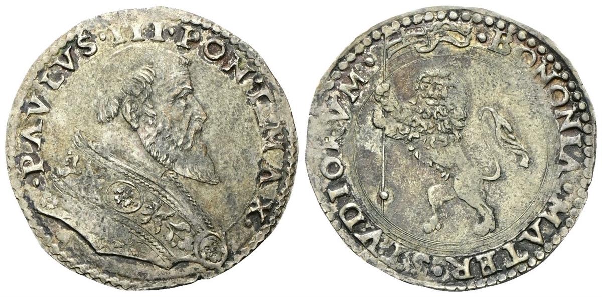 Dr. •PAVLVS• III •PONT• MAX•. Busto a s. con zucchetto e piviale decorato da rosetta ovale e fogliami Rv. •BONONIA •MATER •STVDIORVM•. Leone vessillifero rampante verso s.