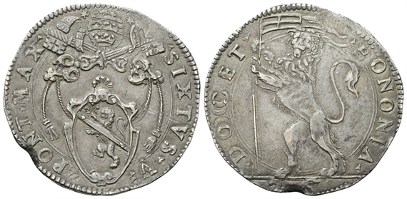 Dr. ✶ -▴SIXTVS▴ V ▴- ▴PONT▴ MAX - ✶. Stemma sormontato da triregno e chiavi decussate. Rv. ▴BONONIA▴ - ▴DOCET▴. Leone vessillifero rampante verso s.
