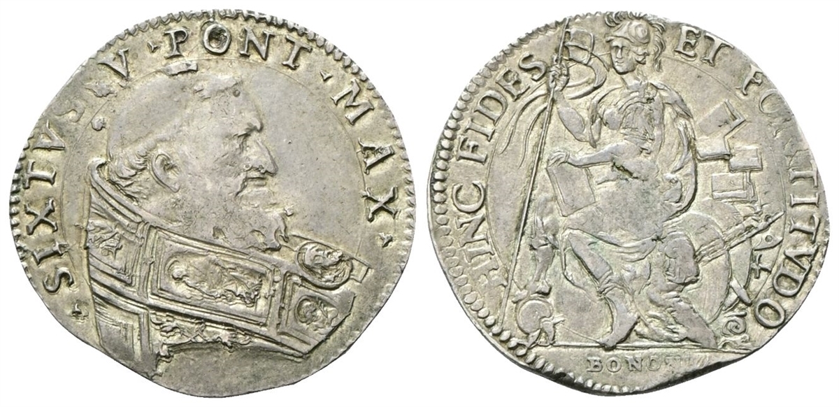 Dr. ▾SIXTVS ▾V ▾PONT▾ MAX▾. Busto a d., con piviale ornato. Rv. HINC FIDES - ET FORTITVDO. Felsina galeata, con vessillo, seduta verso s. su panoplia di armi; a d., cumulo di libri; in esergo, BONONIA.