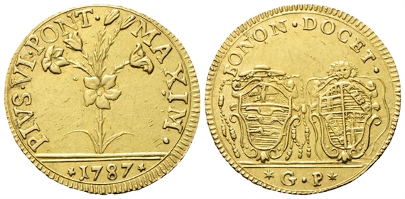 Dr. PIVS• VI •PONT• - •MAXIM•. Pianta di gliglio con fiori; in esergo, 1787. Rv. BONON• DOCET. Stemmi a targa Archetti e di Bologna; in esergo, *G • P*.