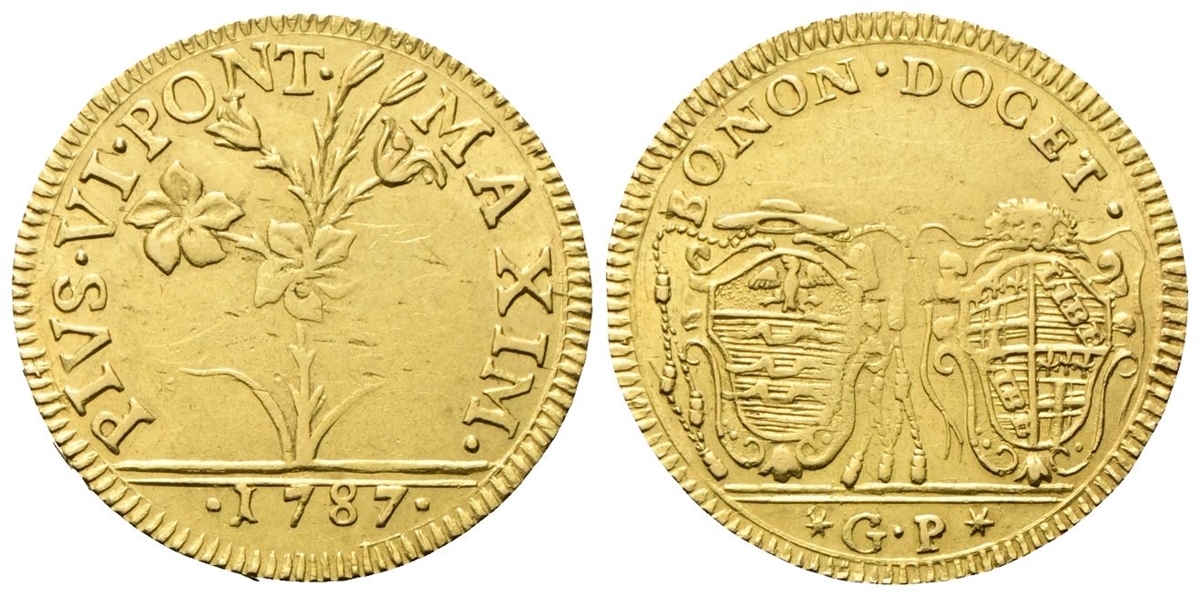 Dr. PIVS• VI• PONT• - MAXIM•. Pianta di gliglio con fiori; in esergo, •1787•. Rv. BONON •DOCET•. Stemmi a targa affiancati, a s. Archetti, a d. di Bologna inquartato; in esergo, *G •P*.