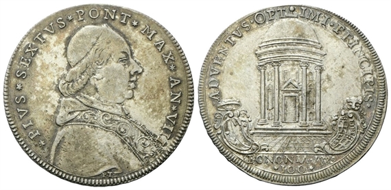Dr. ✶PIVS✶ SEXTVS✶ PONT ✶MAX✶ AN ✶VIII. Busto a d. con zucchetto e stola decorata con arabeschi; sotto la troncatura del braccio, PT. Rv. ✶ADVENTVS ✶OPT - IMI ✶PRINCIPIS.✶ Tempietto rotondo; ai lati, armetta Boncompagni - armetta di Bologna; in esergo, BONONIA 1782 / valore.