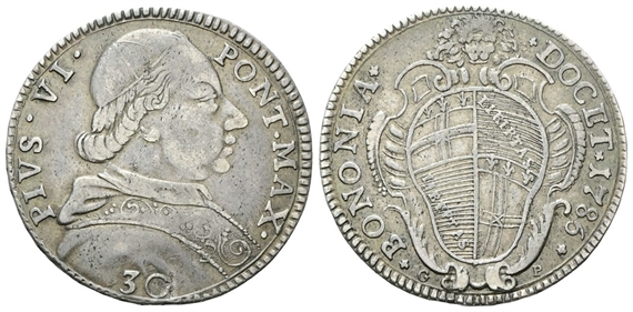 Dr. PIVS• VI• - PONT •MAX•. Busto a d., con zucchetto, mozzetta e stola; sotto, 30. Rv. ✶BONONIA✶ - ✶DOCET✶ 1786✶. Stemma della Città sormontato da maschera leonina.