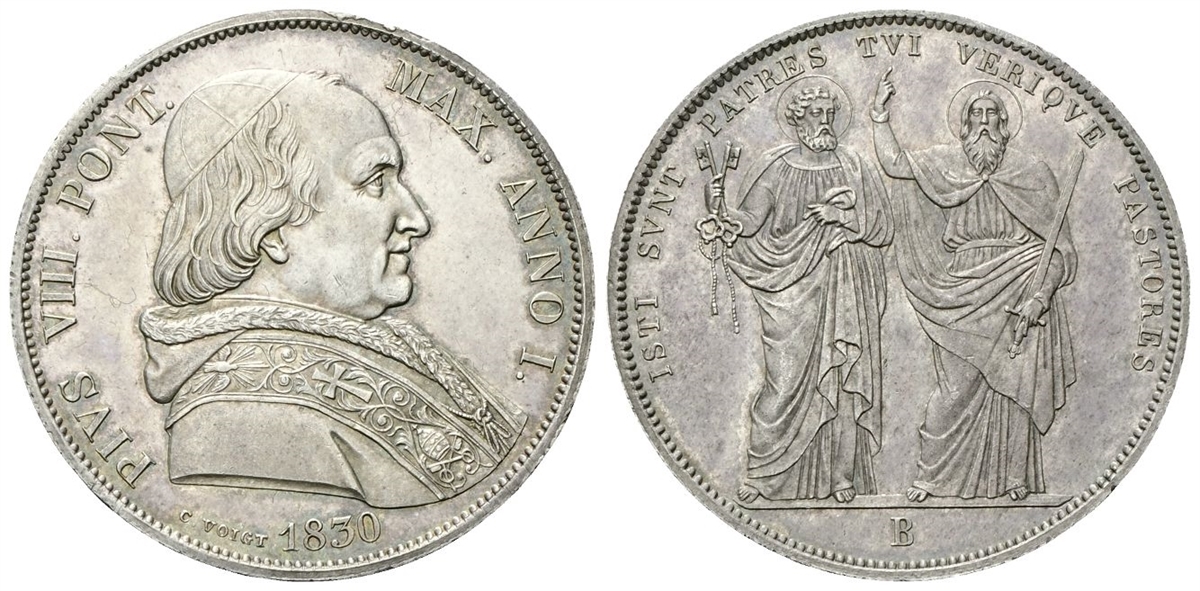 Dr. PIVS VIII• PONT• - MAX• ANNO I•. Busto a d., con zucchetto, mozzetta e stola. Rv. ISTI SVNT PATRES TVI VERIQVE PASTORES. San Pietro, con chiavi, e Paolo, con spada, affiancati; in esergo, B.