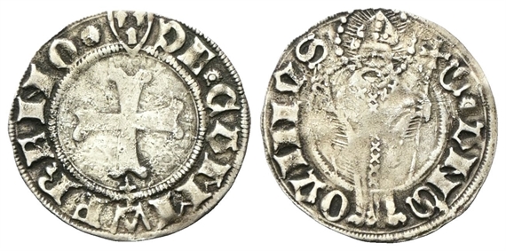 Dr. (armetta della città) DE ✿CAMMERENO ✿. Croce ancorata; sotto, segno di zecchiere. Rv. S ✿ ANS - OVINVS. Il Santo stante e frontale, con pastorale nell’atto di benedire.