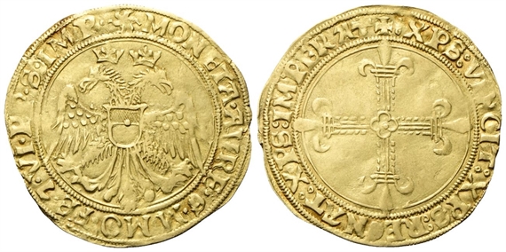 Dr. (sole)MONETA• AVRE• G •M MO• FE• 7• VI• PP• SI MP•. Aquila a due teste coronate. Rv. +:XPS:VINCIT:XPS:REGNAT:XPS:IMPERAT. Croce ornata e gigliata.