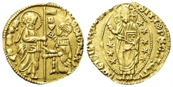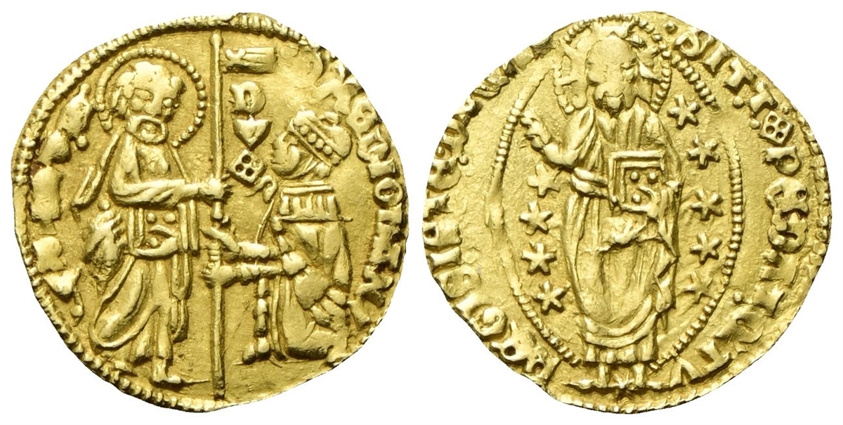 Dr. •D MEDIOLANI - S• PETRV•. Il Santo stante verso s., porge il vessillo al Doge genuflesso. Rv. •SIT• T •XPE DAT• QTV - REGIS ISTE DVC. Il Redentore benedicente, entro aureola ellittica di stelle.