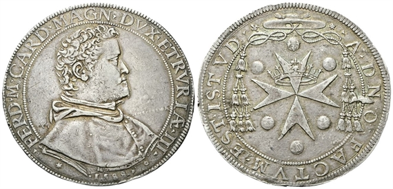 Dr. ▾FERD▾M▾CARD▾MAGN▾ DVX ▾ETRVRIAE▾III▾. Busto a d., in abito cardinalizio; sotto, nel giro, 1588. Rv. ▾A DN - O - FACTVM▾ EST▾ISTVD▾. Croce di S. Stefano coronata e sormontata da cappello cardinalizio con cordoni e fiocchi.
