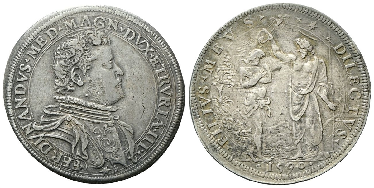 Dr. ▴FERDI - NANDVS▴ MED ▴MAGN▴ DVX▴ ETRVRIAE▴III•▴-✶ . Busto drappeggiato e corazzato a d. Rv. ▴FILIVS▴ MEVS▴ -▴ ✶- DILECTVS▴. Il Battesimo di Cristo; in esergo, 1590.