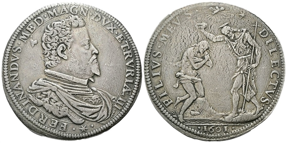 Dr. ✶- •FERDINANDVS •MED• MAGN• DVX •ETRVRIAE III - •. Busto drappeggiato e corazzato a d. Rv. FILIVS• MEVS• -✶- DILECTVS•. Il Battesimo di Cristo; in esergo, 1601.