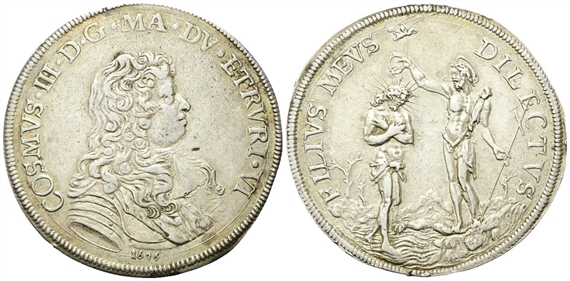Dr. COSMVS• III• D •G• MA• DV• ETRVRI• VI. Busto a d. corazzato. Rv. FILIVS MEVS - DILECTVS. San Giovanni battezza Gesù Cristo nelle acque del Giordano.