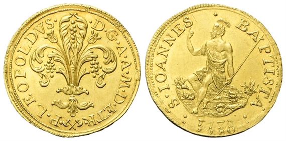 Dr. •P• LEOPOLDVS• - •D• G• A• A• M• D• ETR•. Il giglio di Firenze con due fiori; sotto, alabare decussate (Antonio Fabbrini). Rv. •S• IOANNES - • - BAPTISTA•. Il Santo in figura giovanile, seduto verso s. su zolla erbosa, tiene la d. alzata e nella s. lunga croce.