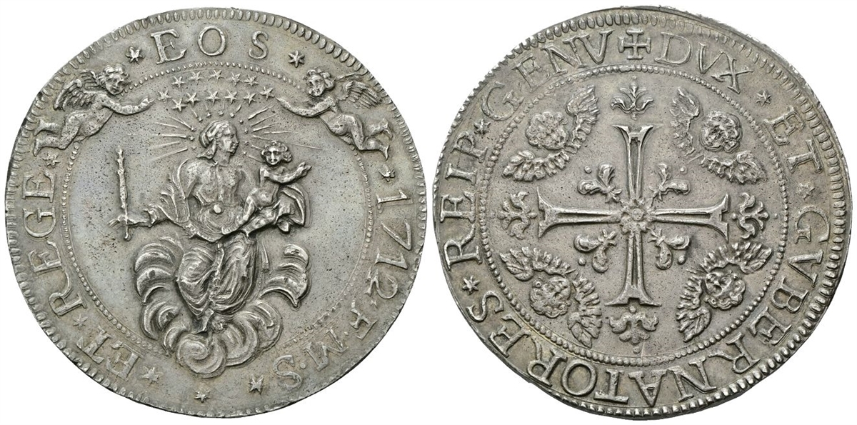 Dr. ✶ET ✶REGE - ✶EOS✶ - ✶1712 ✶F • M• S✶✶. La Beata Vergine col Bambino sulle nubi; sopra, due angeli con una corona di stelle. Rv.+ DVX ✶ET ✶GVBERNATORES✶ REIP ✶GENV. Croce accantonata da quattro teste di angelo.