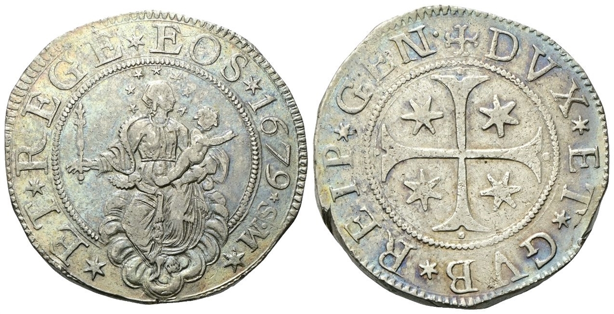 Dr. ✶ET✶ REGE✶ EOS ✶1679★ S M✶. La B. Vergine con il Bambino sulle nubi. Rv. + DVX✶ ET✶ GVB✶ REIP ✶GEN•. Croce patente accantonata da quattro stelle.