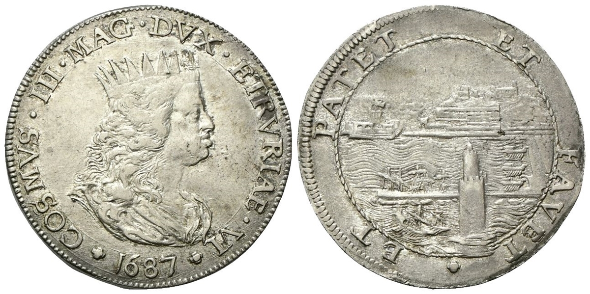 Dr. ✤COSMVS •III •MAG •DVX •ETRVRIAE• VI✤. Busto radiato, drappeggiato e corazzato a d.; sotto, nel giro, 1687. Rv. ✤ET - PATET - ET - FAVET. Veduta del porto di Livorno con vascelli alla fonda e uno che entra nel porto.