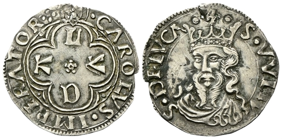 Dr. (armetta Balbani) •CAROLVS• IMPERATOR (quattro globetti). Le lettere L V C A disposte attorno a fiore, tutto entro cornice quadrilobata. Rv. +•S• - VVLTV - S• DE LVCA •. Il Volto Santo a mezzo busto col manto e corona.