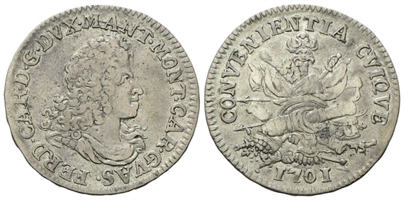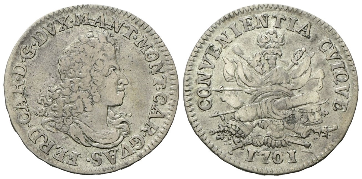 Dr. •FERD •CAR •D •G •DVX•MANT•MONT•CAR•GVAS. Busto corazzato e drappeggiato a d. Rv. CONVENIENTIA CVIQVE. Trofeo d’armi; in esergo, data.