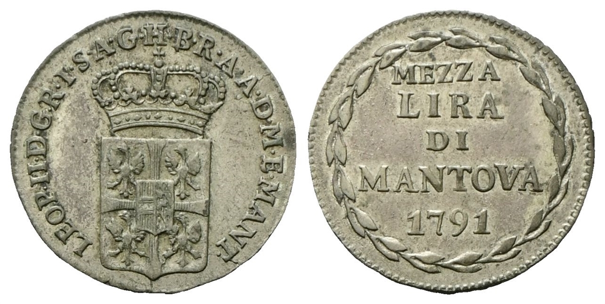 Dr. LEOP• II •D •G •R •I •S• A• G• H• B• R• A• A• D• M• E• MANT•. Stemma coronato. Rv. MEZZA / LIRA / DI / MANTOVA / 1791. Iscrizione disposta su cinque righe entro corona di foglie di alloro.