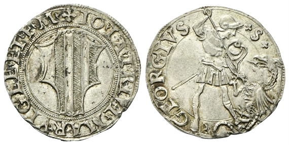 Dr. +IO ▸ IA ▸TRIVL ▸MAR ▸VIGLE▸ ET▸ F ▸M▸. Stemma. Rv. +S+ - GEORGIVS. Il Santo che trafigge il drago.
