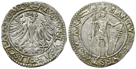 Dr. • LVD• 7• P• LVCAS• FLISC• LAVA• CO• M• D•. Aquila coronata ad ali spiegate. Rv. •SANCTVS• TEONESTVS• MAR• - •. San Teonesto stante con vessillo e spada.