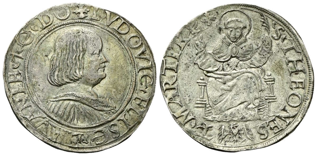 Dr. + LVDOVIC▾FLISC▾LAVANIE▾7▾C▾DO. Busto a d. Rv. ▾S▾ THEONES - T ▾MARTIRI+. San Teonesto seduto su trono regge un ramo di palma; in esergo, un’aquiletta.