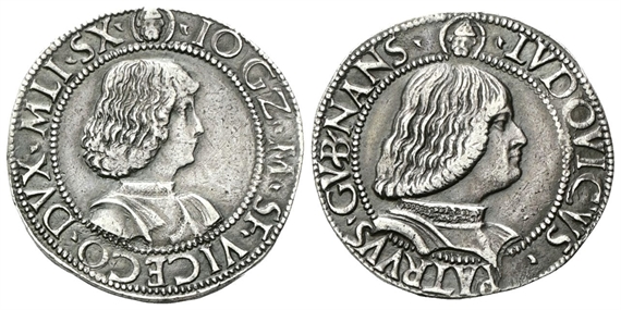 Dr. (testa di Sant’Ambrogio) ▸IO GZ ▸M ▸SF ▸VICECO▸ DVX ▸MLI▸ SX▸. Busto di Gian Galezzo corazzato a d. Rv. (testa di Sant’Ambrogio) ▸LVDOVICVS▸ PATRVVS ▸GVBNANS▸. Busto di Ludovico Maria Sforza corazzato a d.