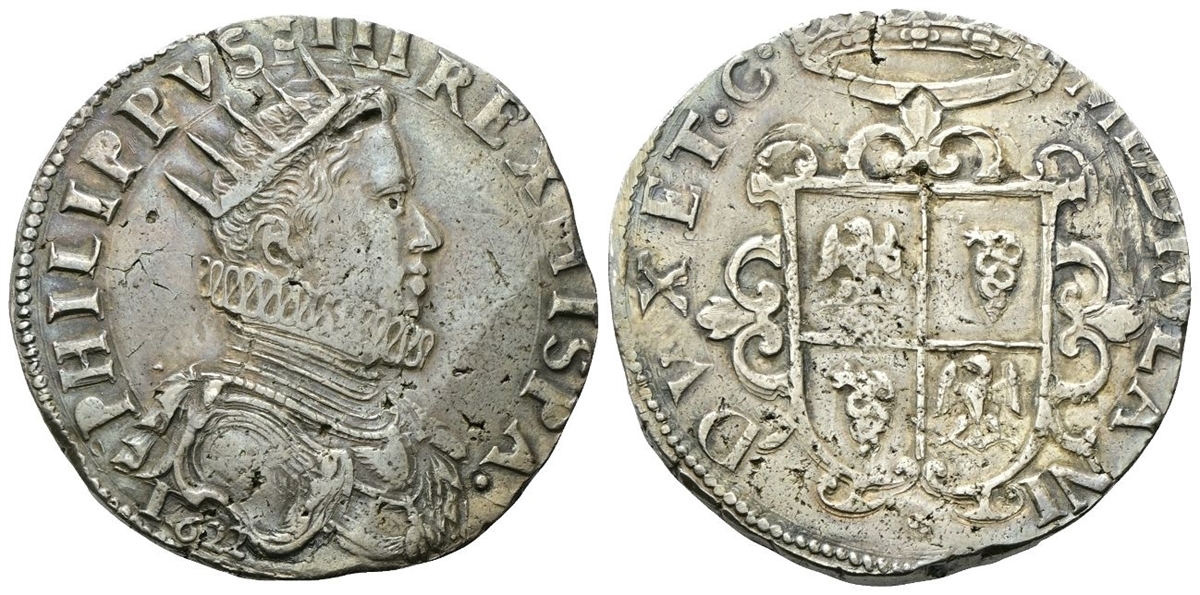 Dr. PHILIPPVS IIII REX HISPA•. Busto radiato, paludato e corazzato a d., con colletto alla spagnola, testina sul petto; sotto, 1622. Rv. MEDIOLANI - DVX ET•C•. Stemma chiuso in alto da un motivo ornamentale e sormontato dalla corona.