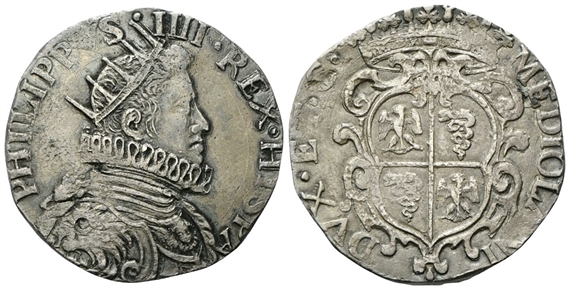 Dr. PHILIPPVS• IIII •REX HISPA. Busto corazzato a d. con testa radiata e colletto alla spagnola; spallaccio ornato da maschera leonina, Collare del Toson d’oro sul petto e testa di angelo. Rv. MEDIOLANI - DVX•ET• C•. Stemma coronato e inquartato con aquile e biscioni.