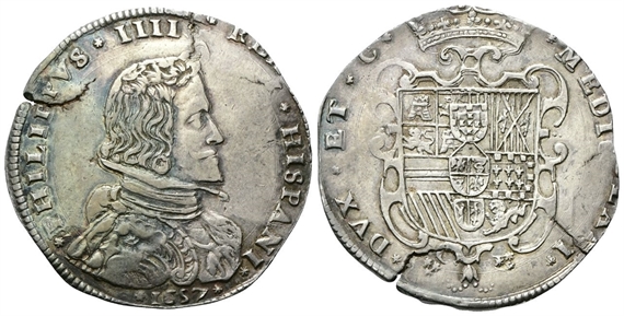 Dr. ✶PHILIPPVS✶ IIII✶ REX ✶HISPANI✶. Busto paludato e corazzato a d.; sotto, 1657. Rv. ✶MEDIOLANI✶ - ✶DVX✶ ET✶ C. ✶Stemma di Spagna coronato e caricato dello stemma di Milano.