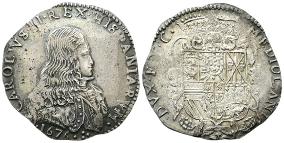 Dr. CAROLVS• II •REX• HISPANIARVM•. Busto corazzato a d.; sotto, data. Rv. MEDIOLANI - •DVX• ET• C•. Stemma spagnolo coronato e caricato delle armi di Milano.