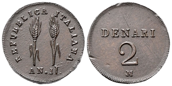 Dr. REPUBBLICA ITALIANA. Spiga; sotto, AN II. Rv. DENARO. Iscrizione disposta su una riga; in esergo, la lettera M.