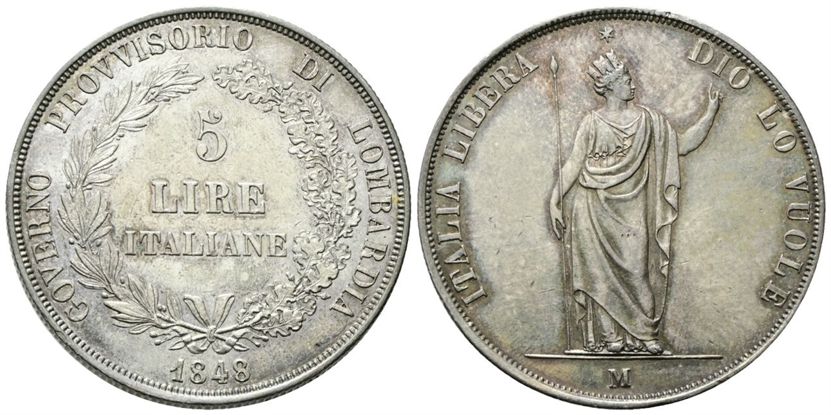 Dr. GOVERNO PROVVISORIO DI LOMBARDIA. Nel campo 5 LIRE ITALIANE tra due rami di lauro e di quercia. Rv. ITALIA LIBERA - DIO LO VUOLE. L'Italia con corona turrita sormontata da stella, stante di fronte e volta a destra, solleva la mano sinistra e regge un'asta nella destra; in esergo, M.