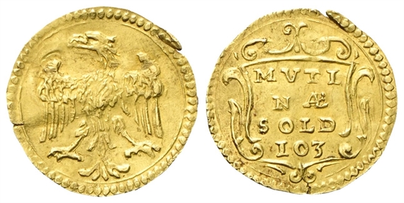 Dr. Aquila ad ali spiegate, volta a s. Rv. MVTI / NÆ / SOLD / 103. Iscrizione disposta su quattro righe entro cartella.