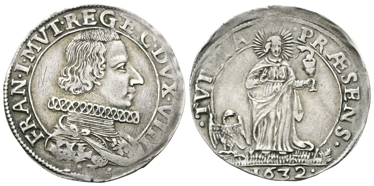 Dr. FRAN •I •MVT• REG• E C• DVX• VIII. Busto a d. corazzato con gorgiera; sotto, I•T•. Rv. •TVTELA - PRAESENS•. San Giovanni Evangelista, nimbato, stante, regge un calice da cui esce un serpente; ai suoi piedi, un’aquila spiegata; in esergo, 1632.