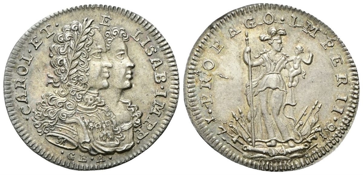 Dr. •CAROL•ET• - E - LISAB•IMP P. Busti accollati di Carlo VI e di Elisabetta a d., nel taglio del braccio, IM; sotto, •GB•A•. Rv. •PROPAGO•IMPERII•. Figura muliebre stante; ai lati, 17 - 16.