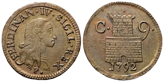 Dr. FERDINAN• IV SICIL REX. Busto, a d.; sotto, P. Rv. Torre merlata; ai lati, C - 9.