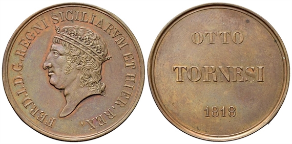 Dr. FERD✦ I✦ D✦ G✦ REGNI SICILIARVM ET HIER✦ REX✦.Testa coronata a s. Rv. OTTO / TORNESI / 1818. Valore e data.