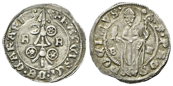 Dr. •FRANCISCI •DE •CARRARIA•. Il carro; ai lati, F - F. Rv. S• PROS - DOCIMVS•. Il Santo nimbato e mitrato in piedi; ai lati, B - Z.