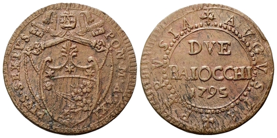 Pio VI (Giannangelo Braschi), 1775-1799. Due Baiocchi 1795 a. XXI.