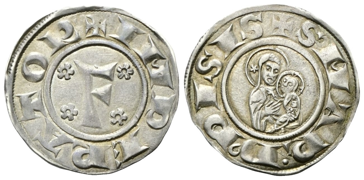 Dr. + IMPERATOR. Lettera F tra quattro rosette. Rv. + •S•MAR•D’PISIS. Mezzobusto della Beata Vergine nimbata e velata, frontale,tiene il Bambino con nimbo crociato sul braccio s. e la mano d. sul petto.