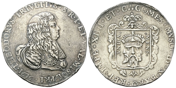 Dr. •THEODORVS •TRIVLTIVS •S• R• I •ET •VAL• MISOL• PRI•. Busto drappeggiato e corazzato a d., con Collare del Toson d’oro sul petto; sotto, nel giro, 1676. Rv. (tre stelle) COMES✶ MVSOCHI✶ X ✶BARO✶ RET✶ IMPE✶ XIIII✶ ET ✶C. Stemma con i tre volti coronati e il motto •VNICA• – •MENS•; ai lati, due cariatidi.